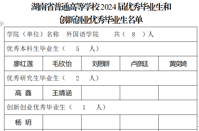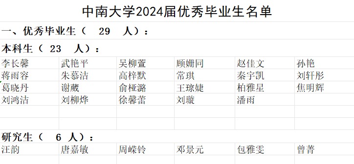 湖南省2024届优秀毕业生、创新创业优秀毕业生和中南大学2024届优秀毕业生推荐名单公示