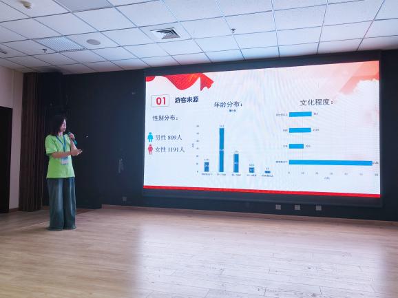 会议第一项,首先由学生队长马鑫做工作总结。马鑫同学从志愿者出勤情况、志愿服务成果等方面总结了同学们这段时间的辛勤付出。之后,副队长李海宁同学针对这段时间的问卷调查进行了分析,包括游客来源、参观动机与时长以及满意度情况,为博物院提供了切实而有效的建议。