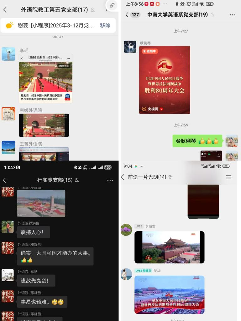 上午9点,纪念大会开始。师生党员们线上线下集中观看直播画面。当国旗冉冉升起、国歌奏响时,全体师生肃立致敬,表达对祖国的无限热爱与崇高敬意。对于习近平总书记发表的重要讲话,师生党员认真聆听、深刻领会。在阅兵式上,人民军队整齐的步伐、先进的武器装备和昂扬的精神风貌,让全体师生倍感振奋与自豪。