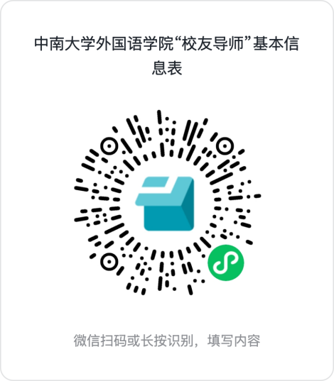 (1)报名方式:符合基本条件的校友均可申请。报名采取校友自荐、校友互荐、学院推荐方式。申报人扫描下方二维码,填写《中南大学外国语学院“校友导师”基本信息表》。