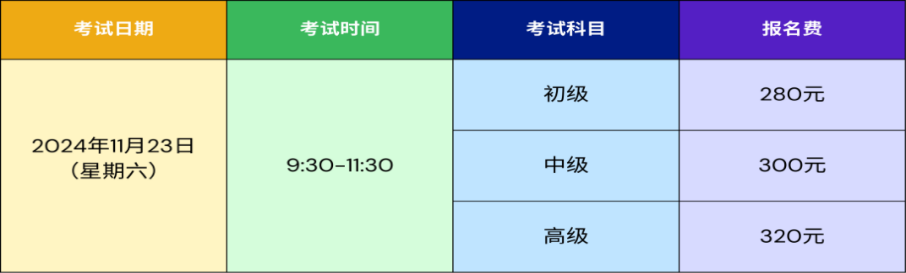 本次考试报名时间截止到20241111日(周上午9:00,考试将于20241123日(星期六)9:30-11:30举行。