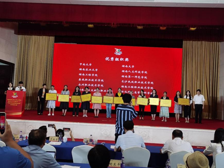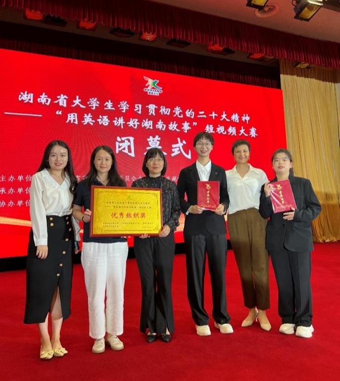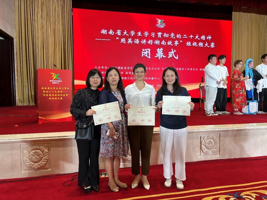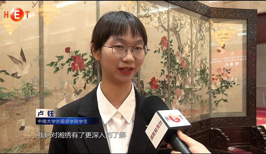 2023年9月15日上午,由中共湖南省委外事工作委员会办公室、中共湖南省委教育工作委员会、湖南省教育厅联合主办,湖南大学和高等教育出版社共同承办的湖南省大学生学习贯彻党的二十大精神——“用英语讲好湖南故事”短视频大赛在长沙闭幕。中南大学获奖作品《匠心·湘绣》主创团队应邀在闭幕式上做创作思路汇报。