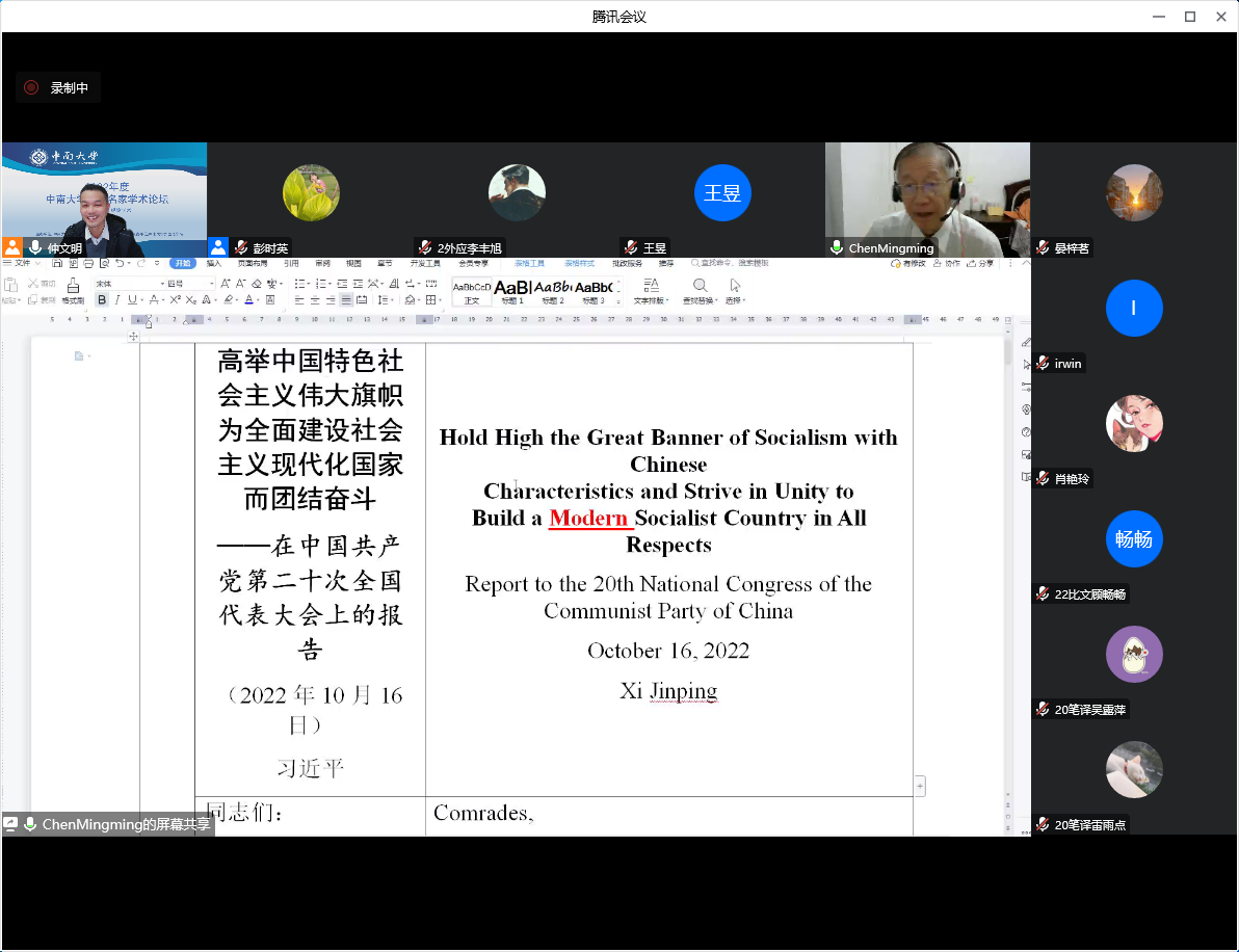 20221215日,应中南大学人事处和外国语学院邀请,外交部外语专家、原外交部翻译室主任、原中国驻新西兰和瑞典等国大使、原中国翻译协会常务副会长、现全国翻译专业资格(水平)考试英语专家委员会副主任委员陈明明先生做客中南大学名师名家学术论坛,在云端为我院师生讲学,主题为“二十大中国政治理念英译解析”。讲座由仲文明副院长主持,两百余名师生在线参加。