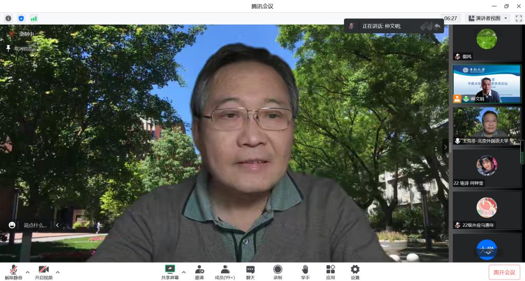 20221214日下午,应中南大学人事处和外国语学院邀请,北京外国语大学讲席教授、教育部名刊《外语教学与研究》主编、《外语与翻译》特约编审、我院杰出校友王克非教授云端返回母校,做客中南大学名师名家学术论坛,在云端为我院师生讲学,主题为“翻译路径及其研究”。讲座由仲文明副院长主持,一百六十余名师生在线参加。