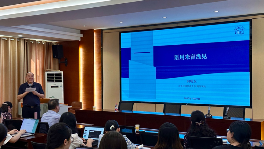 2025年10月9日下午,对外经济贸易大学慧园杰出学者、英语学院院长、博士生导师向明友教授莅临外国语学院,做客“湘江论坛语言学系列讲座”,畅谈“语用未言”。讲座由院长杨文地教授主持,李清平教授、仲文明教授、王华玲副教授等出席,语言学、翻译研究、文学等各专业方向百余名师生参加。