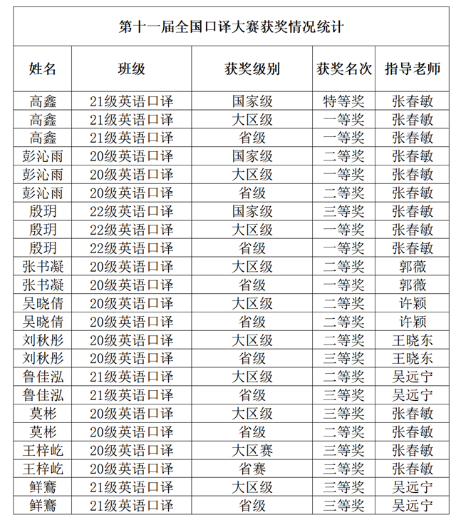 47日,第十一届全国口译大赛总决赛于线上落幕,我院口译方向研究生高鑫获得大赛全国特等奖(季军)、彭沁雨获得全国二等奖、殷玥获得全国三等奖,张书凝、吴晓倩、刘秋彤、鲁佳泓获得大区级二等奖,莫彬、王梓屹、鲜鶱获得大区级三等奖,指导老师吴远宁教授、张春敏教授、郭薇副教授、许颖副教授、王晓东副教授获得“优秀指导老师”奖。