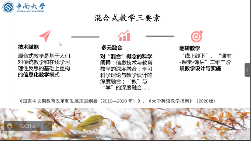 2022年4月6日下午,中南大学外国语学院专业系部主办的本学期教学研讨活动在线上如期召开。本次教研活动由中南大学外国语学院英语系承办,邀请外国语学院获得2022年中南大学本科高等教育教学成果奖的三位老师分享各自获奖培育与申报过程中的体会,研讨会由英语系副主任方哲英主持,通过腾讯会议进行全程直播。会议持续了两个半小时,共有来自外语学院英、法、西、日语各专业以及大学外语部共一百多名教师参加了此次云端会议。