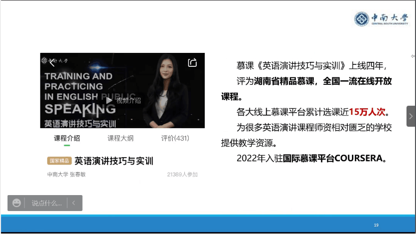 来自英语系获得2022年校本科教学成果二等奖、国家级一流本科课程“英语演讲技巧与实训”负责人张春敏老师分享了题为“英语公众演讲系列教学成果培育”–MCC混合式教学模式构建与实施" 。张春敏老师简短地分享了自己的教学经历之后介绍了自己的竞赛培训过程以及演讲团队模式。在介绍自己的慕课制作历程时,张老师回顾了自己从2017年开始带领选手拍摄制作慕课《英语演讲技巧与实训》到现在已收获了累计15万选课人数,并于2022年成功入驻国际慕课平台Coursera。张老师介绍了如何运用MCC混合式教学模式进行课堂教学改革,展示了英语演讲口译教学竞赛系列成果。介绍了教学成果的应用和推广,包括慕课校外应用和推广、校内讲座和教学模式推广、校外讲座和MCC教学模式推广以及服务社会等。张老师最后分享了申请教学成果奖的经验和教训,指出申报过程中要集结团队力量,学习和查阅最新的教改类文章,要有前瞻性才能获得好的奖项。