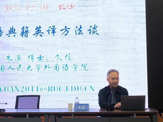 朱源教授做题为“汉语典籍英译方法谈”的学术报告。朱源教授介绍了典籍翻译中常见的几种翻译原则:德莱顿的“三分法”、严复的“信达雅”三原则以及乔治·斯坦纳的翻译“四步骤”。朱教授认为由于典籍英译的复杂性,典籍翻译近乎再创造,因此译文标准更强调准确性与得体性的完美结合,不同的翻译文本需要译者综合考量后,基于合适的翻译原则采取恰当的翻译方法,不能依赖于单一的翻译原则。