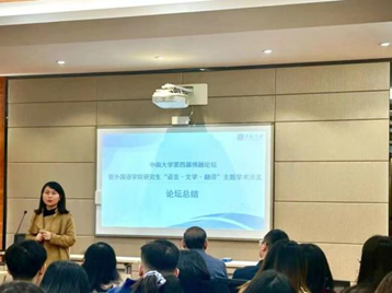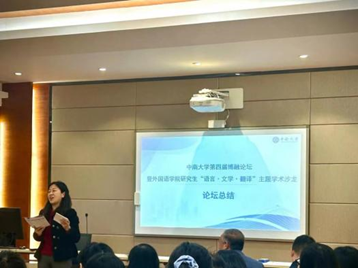 最后,仲文明副院长对论坛进行简要总结。借《礼记·学记》与东汉王充《论衡·量知篇》中的名句,“独学而无友,则孤陋而寡闻。切磋琢磨,乃成宝器。人之学问,知能成就,犹骨象玉石切磋琢磨也”,仲院长表示,尽管同学们在选题和写作逻辑等方面仍有改进之处,但也展现了蓬勃朝气,不少同学的研究主题、研究方法都让人耳目一新,展现出了学术研究潜力和创新能力。他提出,第一,我们不应拘泥于传统语种和研究领域的划分,而应该从研究方法、跨学科视角和交叉学科视角探索更多主题,开拓新的研究领域。第二,希望大家能够多读多写,开拓研究视野、提升研究能力和学术水平,找到兴趣方向,为未来的学术研究打下坚实基础。
