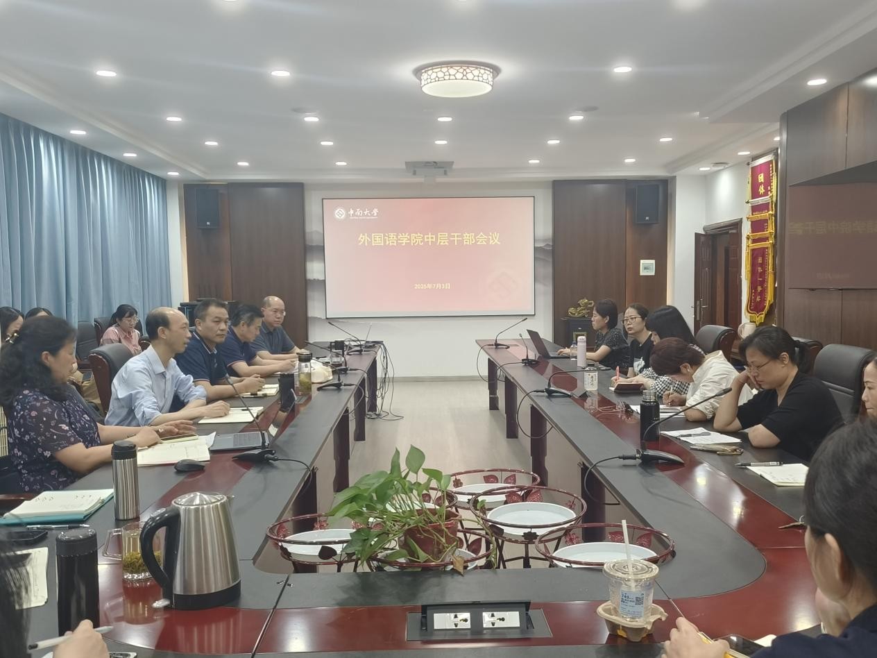7月3日下午,外国语学院中层干部会议在332会议室召开,党委书记李涛,院长杨文地,党委副书记孙胜,副院长范武邱、仲文明、王华玲、鄢宏福及全体系、室、中心主任出席会议。会议全面总结了2025年上半年学院各项工作,并对下一阶段工作和重点任务进行了研究部署。杨文地在对学院发展的整体状况进行概括总结之后,围绕教育使命、教学改革及教学方法创新向全体教师提出明确要求与殷切期望。他指出,专业改革与大学外语教学改革需协...