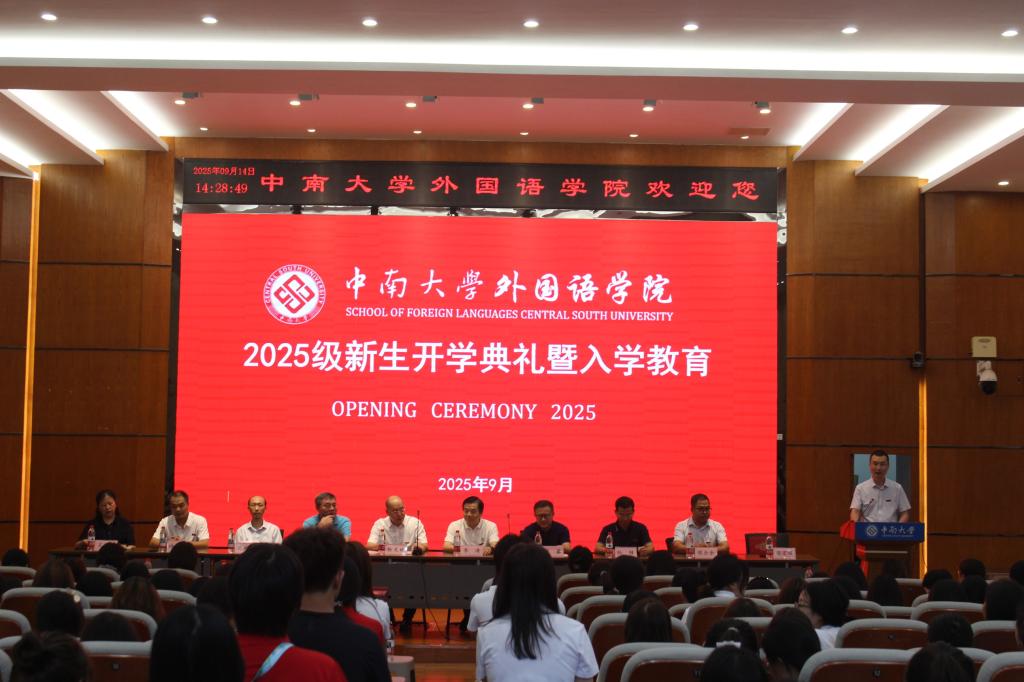 2025年9月14日下午14:30,中南大学外国语学院2025级新生开学典礼于中南大学潇湘校区外语楼报告厅拉开序幕。本次典礼由外国语学院党委委员、副院长鄢宏福主持,出席本次大会的有外国语学院党委书记李涛,院长、党委副书记杨文地,党委副书记孙胜、副院长范武邱,党委委员、副院长侯合余、仲文明、王华玲,资深导师代表路旦俊、校友代表湖南省新零售行业协会创会会长叶蓁,英语系副主任方哲英、法语系副主任刘田丰、日语系主任邓...