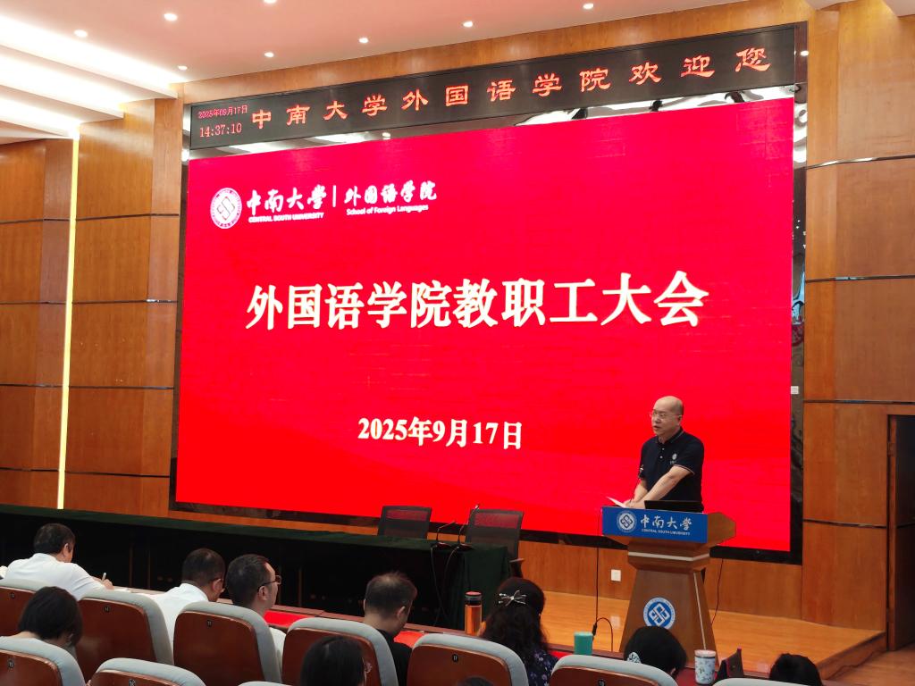 2025年9月17日下午,外国语学院于一楼国际报告厅召开教职工大会,对上学期及暑期工作进行总结,对2025年秋季学期工作进行动员部署。大会由学院党委副书记孙胜主持,党政领导班子成员出席,全体教职工参会。院长杨文地进行工作总结。他指出目前学院发展势头良好,在师资队伍建设、人才培养、学术科研、学科建设等方面都有不错进展。取得国家社科基金面上项目3项,国家一流课程1门;学院教师获得金隄翻译奖,已进入终审,参评梁宗...