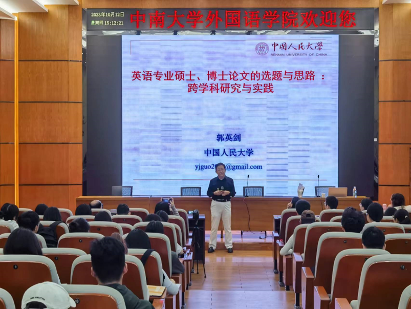 10月12日,应中南大学外国语学院邀请,中国人民大学首都发展与战略研究院副院长、中国人民大学“杰出学者”特聘教授、外国语学院二级教授、博士生导师郭英剑教授做客湘江外国文学论坛,在国际报告厅为广大师生带来一场精彩的学术讲座。讲座由院长杨文地教授主持,范武邱副院长、仲文明副院长、鄢宏福副院长等近两百名师生参与了此次讲座。讲座主题为“英语专业硕士、博士论文的选题与思路:跨学科研究与实践”。郭英剑教授以跨...